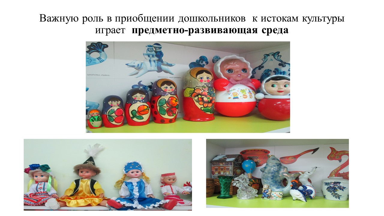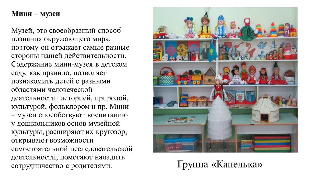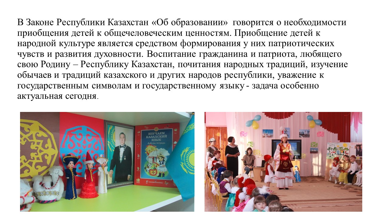 Прошли майские праздники и как нельзя ,кстати , творческая группа «Любознайка» подготовила для педагогического коллектива презентацию «Роль предметно-развивающей среды по приобщению дошкольников к истокам культуры народов Казахстана». В Законе Республики Казахстан «Об образовании» говорится о необходимости приобщения детей к общечеловеческим ценностям. Приобщение детей к народной культуре является средством формирования у них патриотических чувств и развития духовности. Воспитание гражданина и патриота, любящего свою Родину – Республику Казахстан, почитания народных традиций, изучение обычаев и традиций казахского и других народов республики, уважение к государственным символам и государственному языку - задача особенно актуальная сегодня.» Важную роль в приобщении дошкольников к истокам культуры играет предметно-развивающая среда,с которой и познакомили члены группы…
